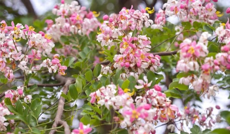Hoa của cây Muồng Anh Đào chính là điểm nhấn nổi bật nhất. Hoa thường nở thành từng chùm lớn, có màu hồng phấn hoặc hồng đậm, nở rộ vào mùa xuân và mùa hè, thu hút nhiều sự chú ý. Hoa có cấu trúc gồm 5 cánh mỏng manh, đối xứng nhau, tạo thành hình dáng tương tự như hoa anh đào Nhật Bản, nhưng với kích thước lớn hơn. Hương thơm nhẹ nhàng của hoa Muồng Anh Đào cũng góp phần làm tăng sự hấp dẫn của loài cây này trong cảnh quan.
